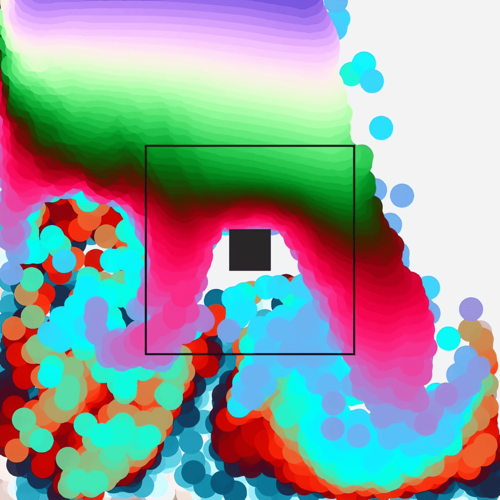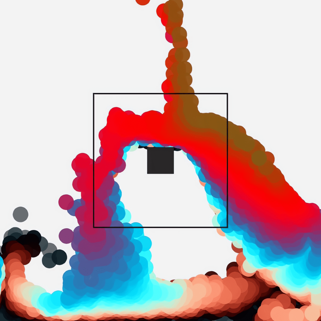liquiDrama is a video arranged as a diptych in a temporal sequence in which each part has it’s own textural, visual, and sound form. The video was produced from the Processing programming environment. The application uses algorithms in which they simulate fluids (box2d). From this, a small conflict is formed between liquid form and solid obstacles. The friction between both shapes impacts the complexity of the fluid shape that is enhanced by dynamic sounds and colors. For these, sinusoidal and random functions were applied.